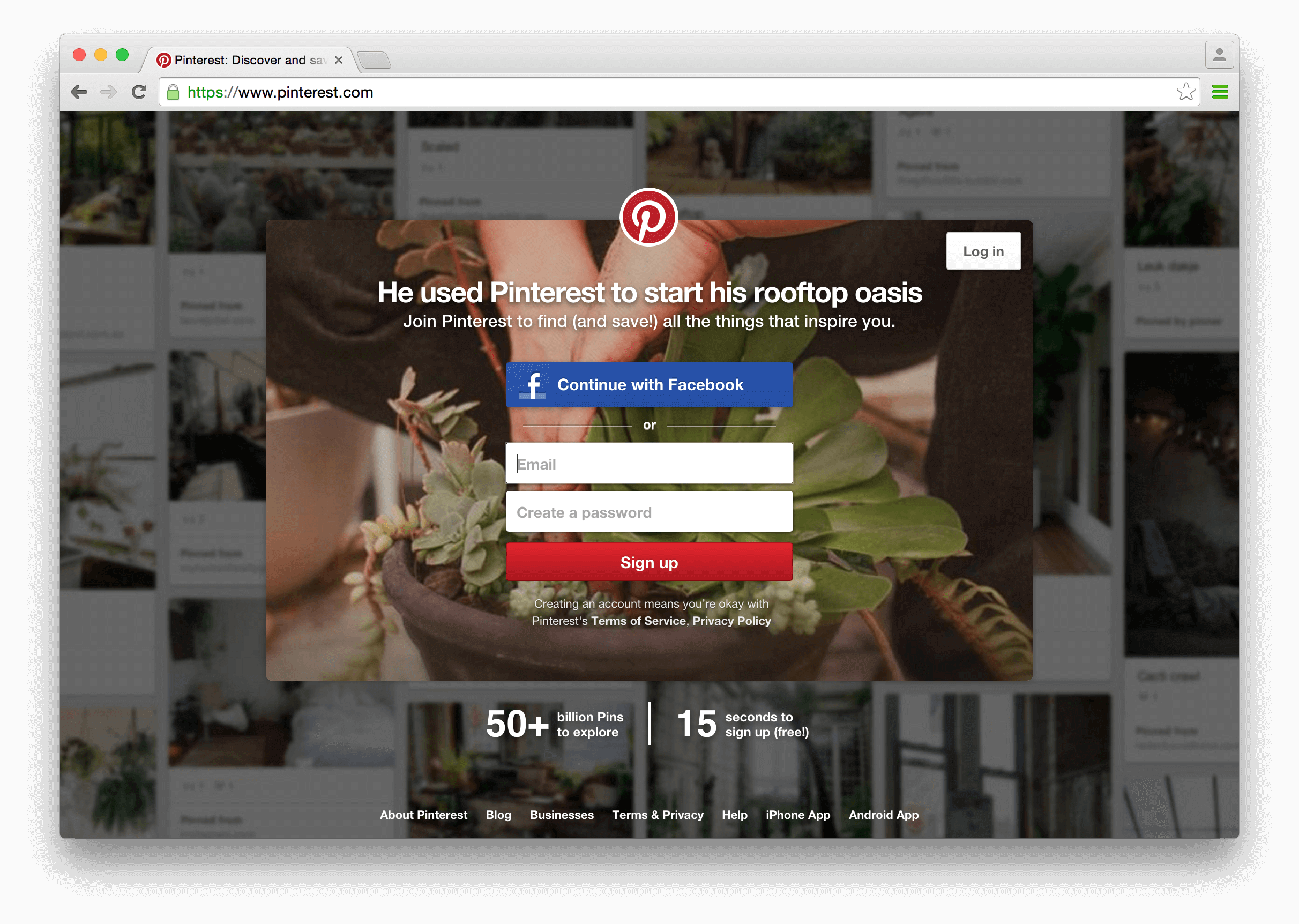 Instagram heavily emphasizes social login on their habitation screen. Log in with Facebook is the elevation and highlighted selection, whereas email is put underneath in plaintext.